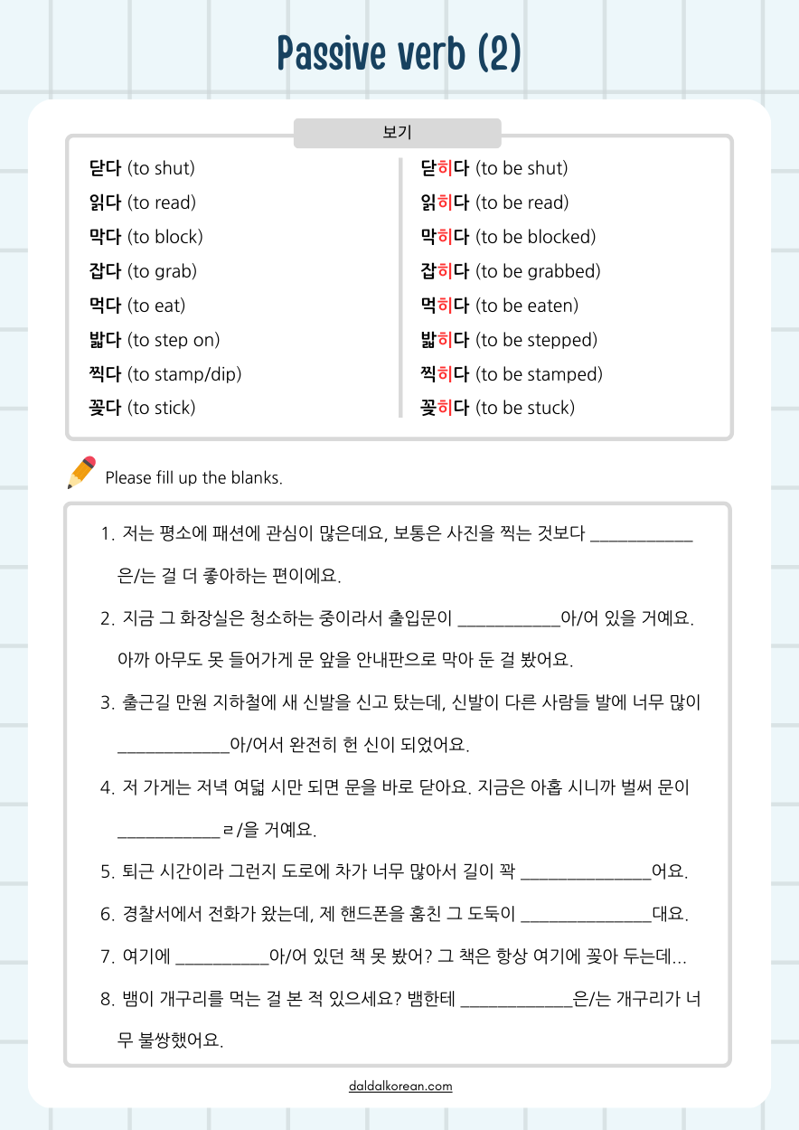| Worksheet | Passive Verb Practice (4) | 피동 접미사 '-기-' (0) | 2023.03.06 |