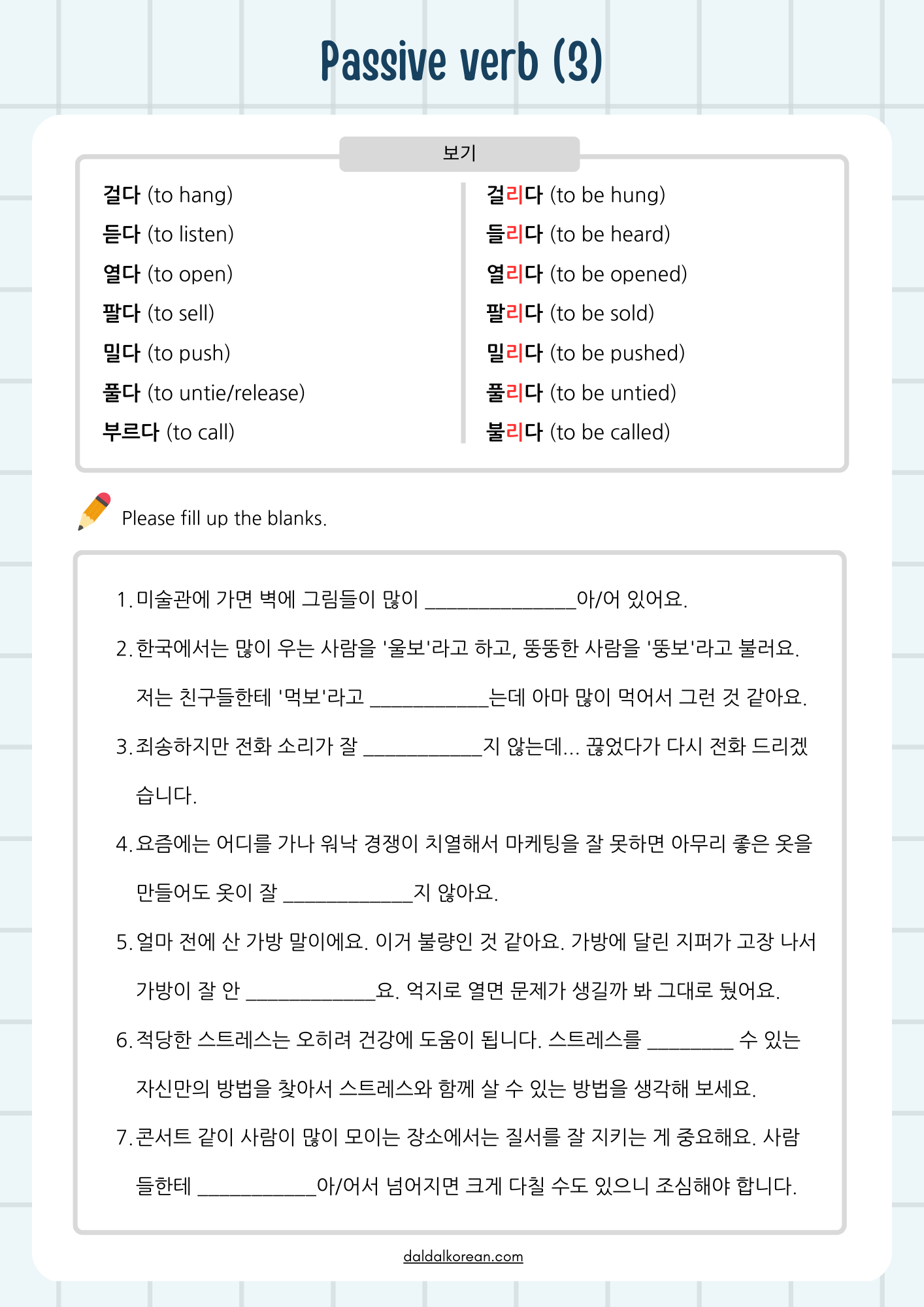 | Worksheet | Passive Verb Practice (4) | 피동 접미사 '-기-' (0) | 2023.03.06 |