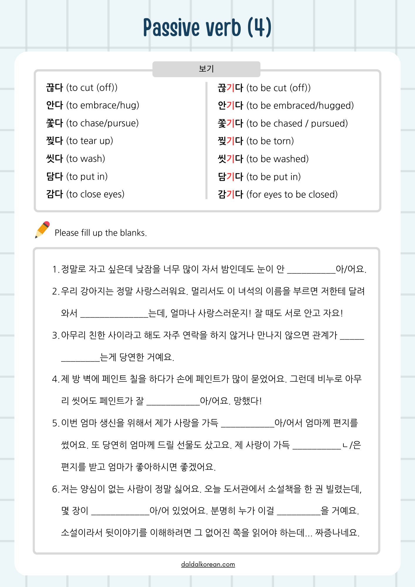 | Worksheet | passive forming suffix -아/어지다: Part 2 (0) | 2023.03.17 |