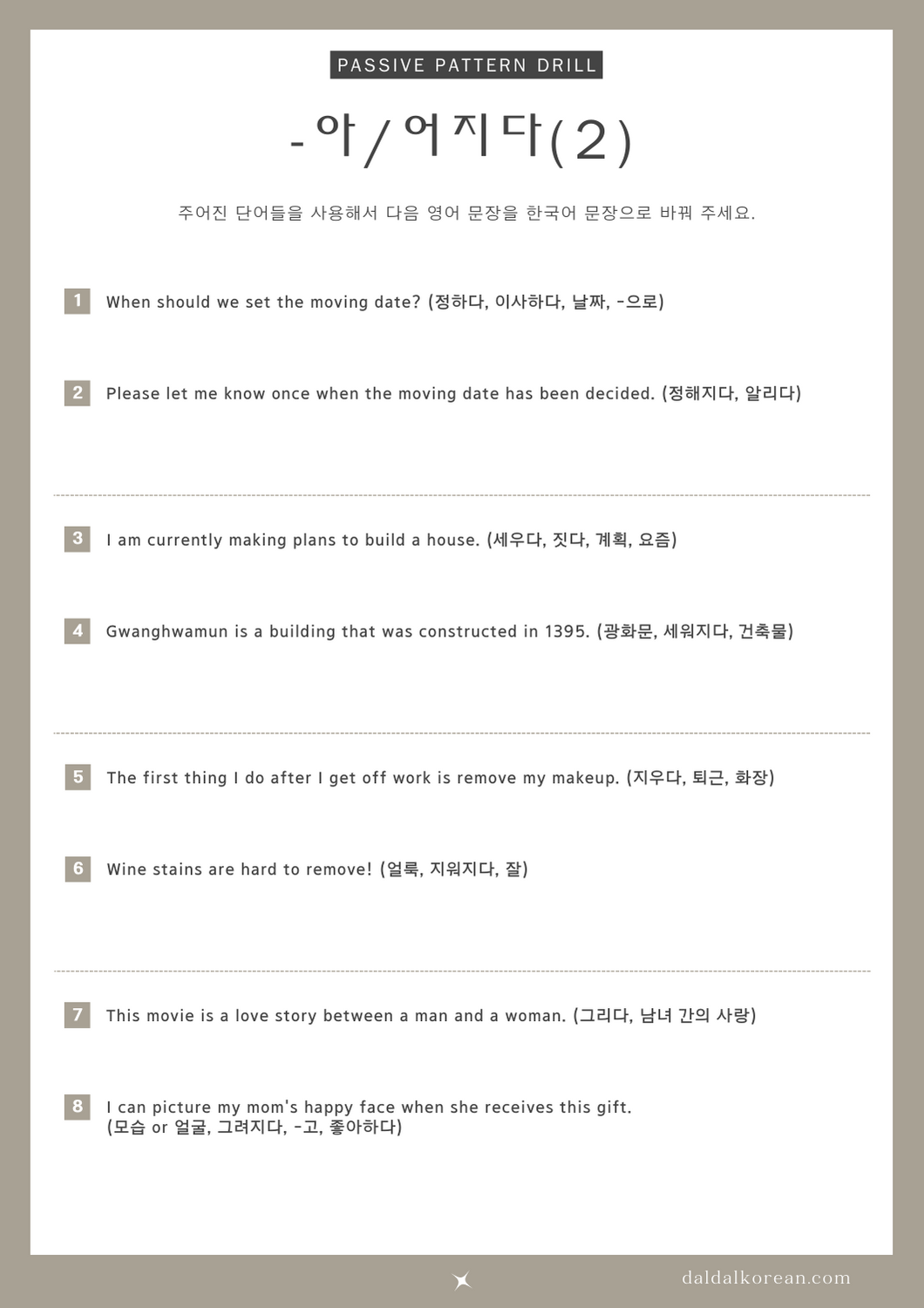 | Worksheet | passive forming suffix -아/어지다 (0) | 2023.03.14 |