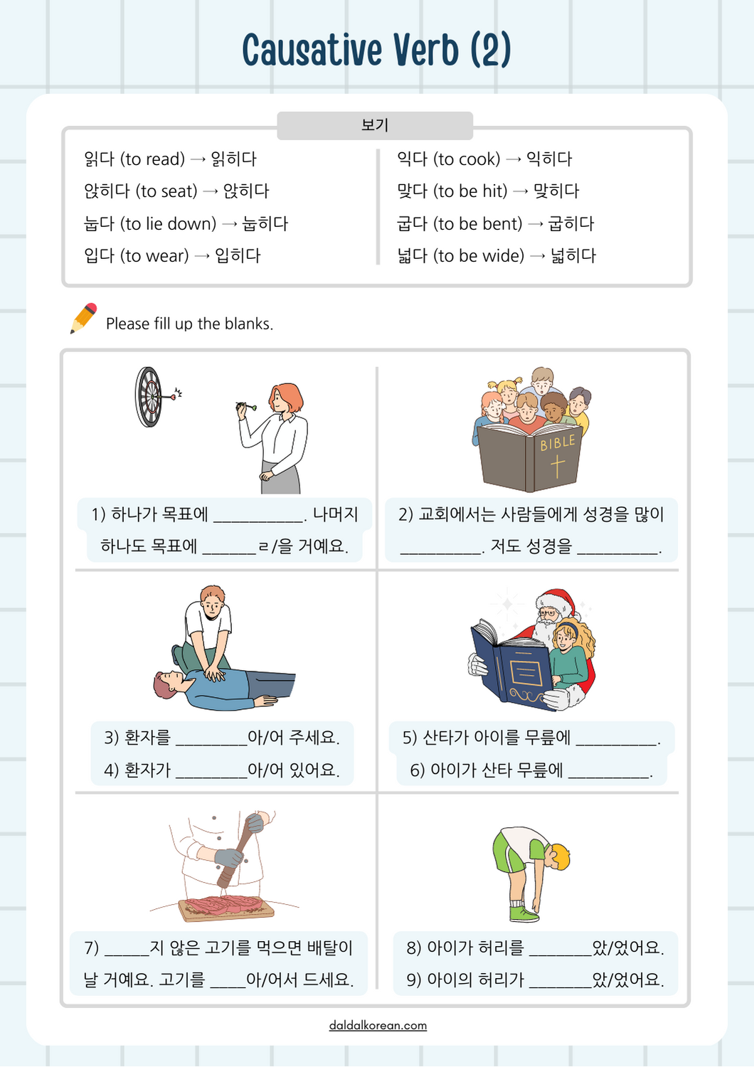 | Worksheet | Causative Verb Practice (4) | 사동접미사 '-기-' (0) | 2023.04.17 |