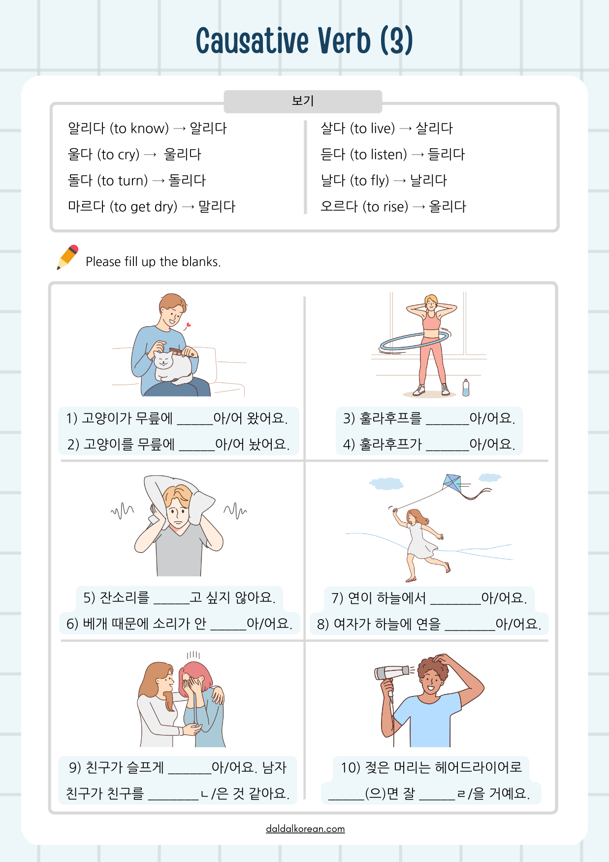 | Worksheet | Causative Verb Practice (1) | 사동 접미사 '-이-' (0) | 2023.04.07 |
