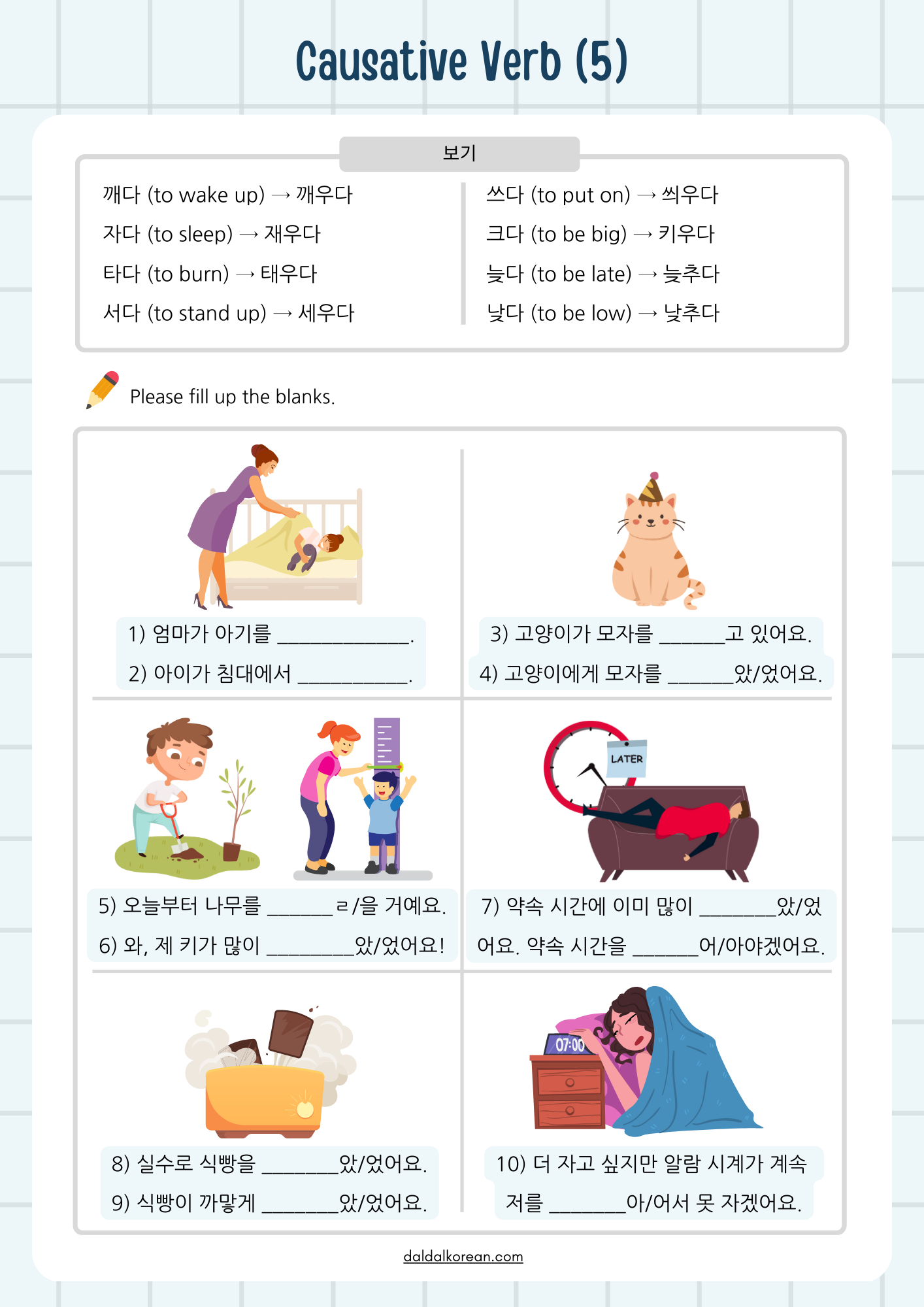 | Worksheet | Causative Verb Practice (3) | 사동 접미사 '-리-' (0) | 2023.04.14 |