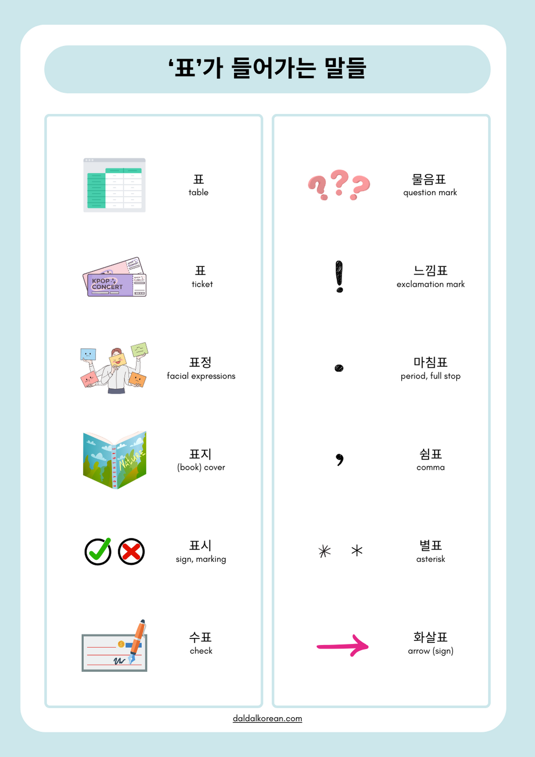 | 표 (表) | table, sign |