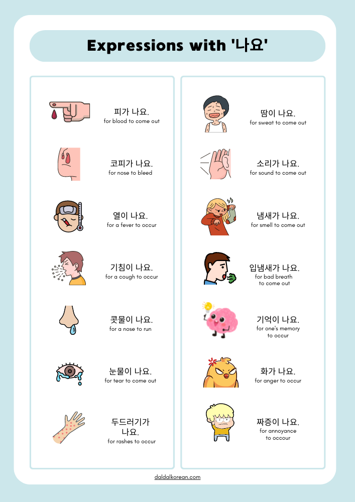 | 콧물이 나다 | for a nose-water to come out | 저는 콧물이 나요. (I have a runny nose.) |