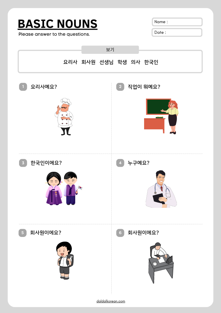 | Worksheet | Very Basic Sentence & Noun Practice | 기초 문장과 사물 명사 워크시트 (0) | 2022.10.11 |